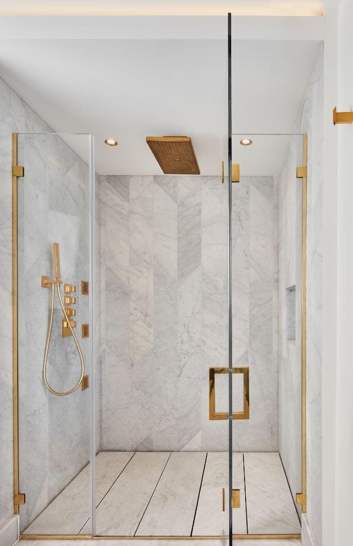 The master en suite is symmetrical around the bathtub and is shown in detail within the photographs on this and the following pages. The master en suite can either flow from the dressing room into the bedroom, or be closed off for more privacy, via the pocket doors that slide back into the walls of the dressing room. The sliding doors move as a pair via a recessed mechanism in the door head, so that when one door is pulled or pushed the other also moves in the same direction. Sanitaryware, brassware and lighting, together with the materials of the Master en suite that consist of marble, waterproof wallpaper & textiles, together with painted surfaces, were carefully selected to complement the overall character of Casalinda. They offer high levels of practicality but are a pleasure to use and experience aesthetically everyday.