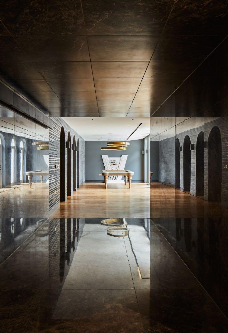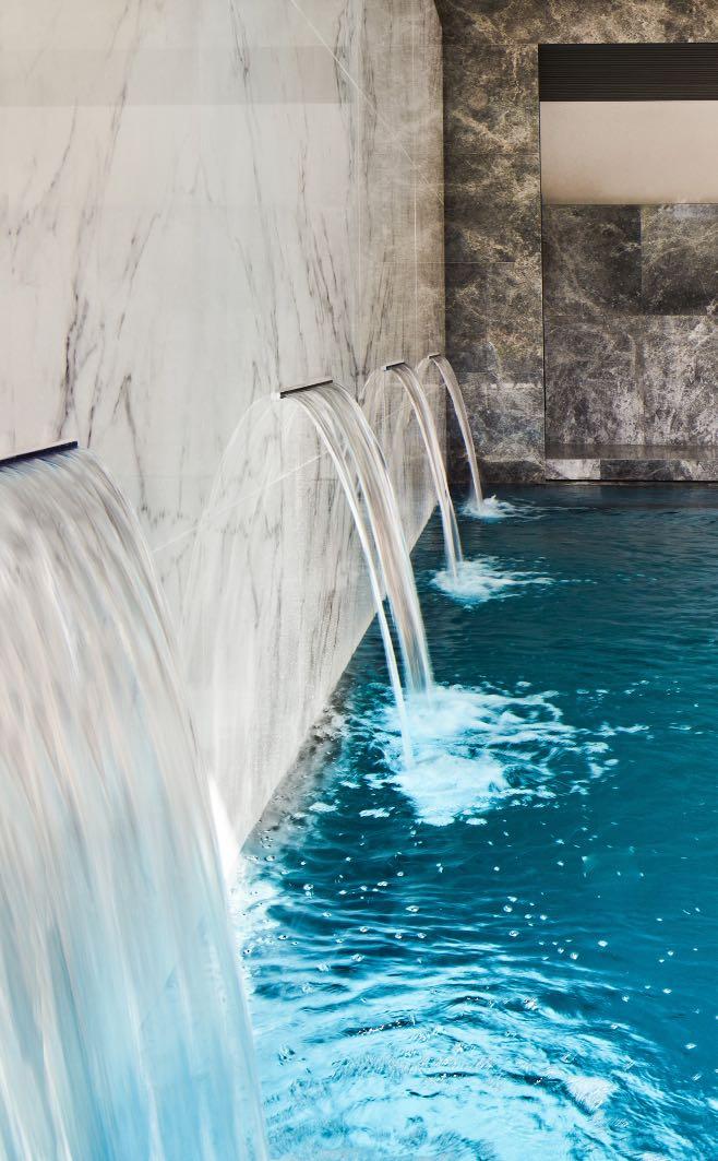The level deck nature of the pool means that there is a continuous, gentle sound of cascading water. When the four waterfalls are turned on, an energetic drama is created, that is best enjoyed in the summer when the pool enclosure‘s 3.5m high glazed doors are pealed back and the space flows seamlessly into the Main Patio. The waterfalls are located on a wall clad in 2.4 x 1.2m book matched white marble tiles that rise out of the Swimming Pool.