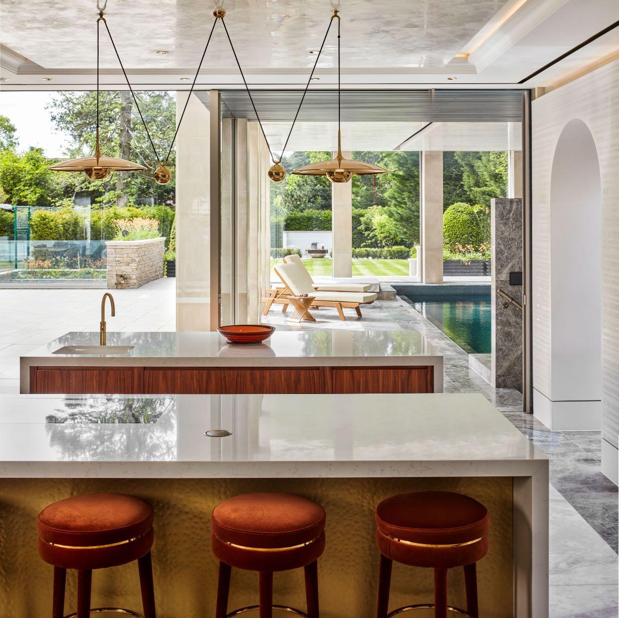 contrasts the classical nature of the principal form. The pool area is one of the many highlights of the design, where Swiss made sliding double glazed doors of nearly three and half metres in height effortlessly peal back to create the perfect summer experience to share with friends and family, as the generous Main Patio, Swimming Pool and Kitchen become one unified space.