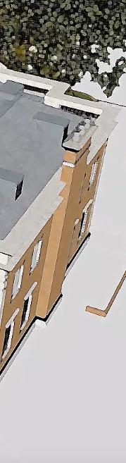 • Wall facing the side road is finished in a dark through colour render inbetween Portland stone finish cast stone pilasters.