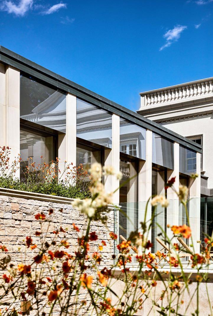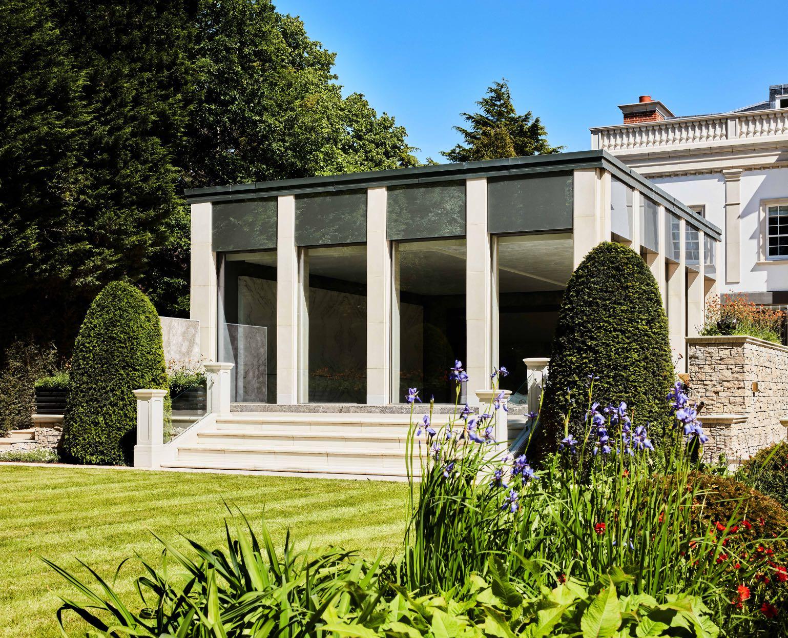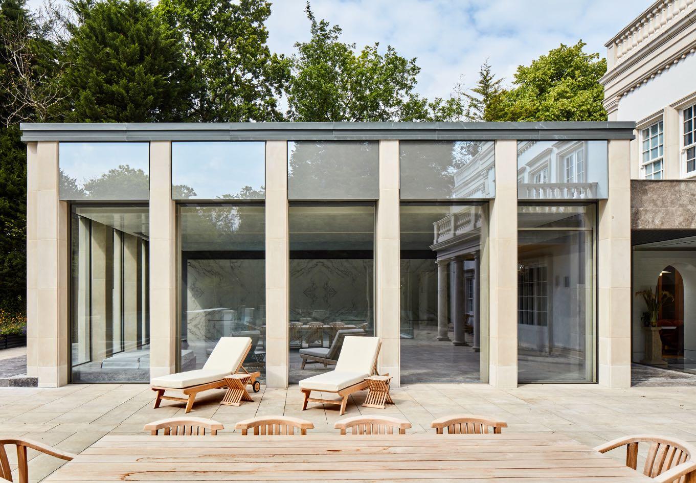 • The swimming pool enclosure parapet wall is overclad with metallic paint backed glass rainscreen panels that reflect the classical detailing of the main building and the surrounding mature landscape.