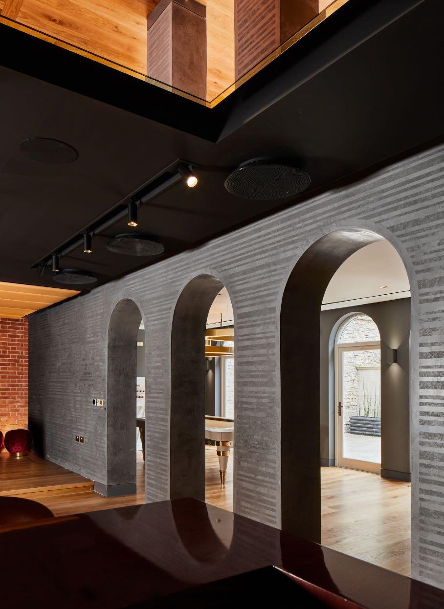 The Informal Dining Room is accessed via three semi-circular arches. On the kitchen side, the wall containing the arches is treated like a plain, as can be seen in the photograph on Page 104. The effect of this applied element is accentuated using LED backlighting. On the Informal Dining Room side, the monumental depth of the wall is fully celebrated. The wall is finished on both sides with a technique whereby rough specialist plaster basecoat is applied, before areas are masked off and polished plaster is applied and finished. Once the mask is removed, it creates the rich, stripped, textural finish shown in the photographs below. The Kitchen continues one of the themes of Casalinda; that of concealment and surprise. The practical sink area of the Kitchen, which is shown in its revealed state in other photographs, can be seen in the below photograph as it appears when it is concealed behind the folding/sliding book matched American Walnut panels. There are two narrow hinged doors next to the ovens, on the left and right of the below photograph, that open to accommodate the panels and are then closed. The area appears perfect whether the sink is concealed or exposed.