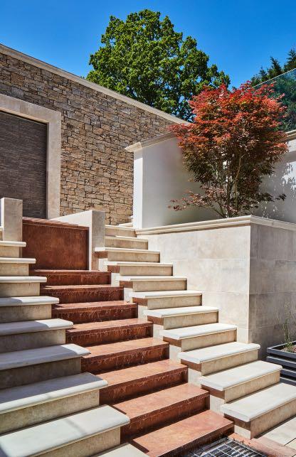 the Basement Patio are finished in natural stone look porcelain paving slab. The slabs are of various sizes and are laid out to the design created by AV Architects to create defined external areas.