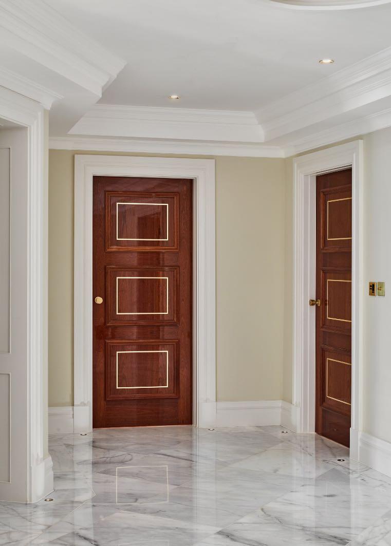 Due to the client’s preference for brass as the metal finish at Casalinda, we decided that Sapele would be the perfect accompanying timber, rather than a solid colour. The doors are highly glossed and have raised beading with a gold colour metal inlay, as seen on the photographs on this page and in the photographs throughout this document.