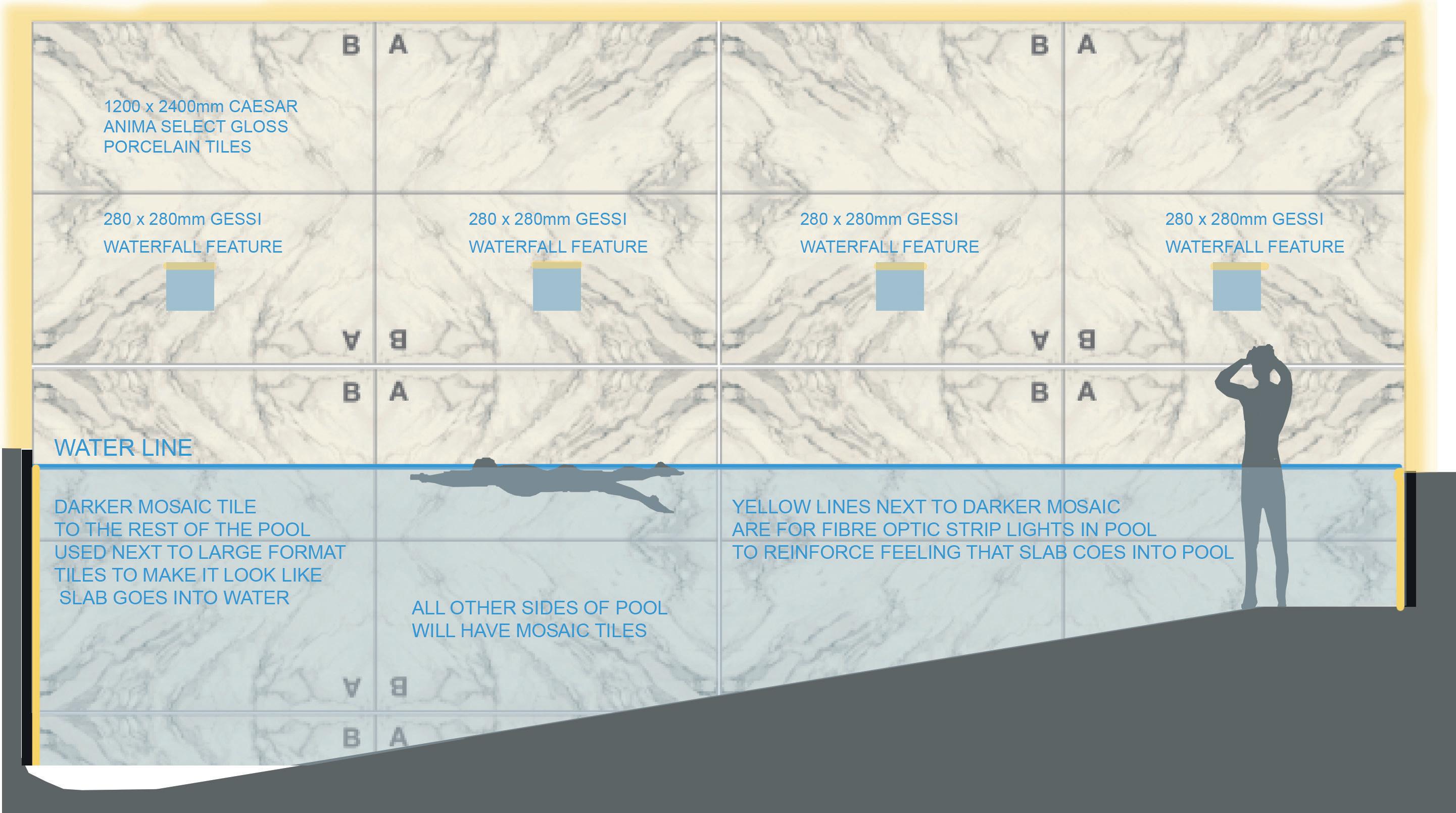 • Feature silver-grey marble raised seating area and wall to the end of the pool enclosure nearest to the lawn to create the necessary visual connection back to the pool enclosure‘s internal environment and link structure.
