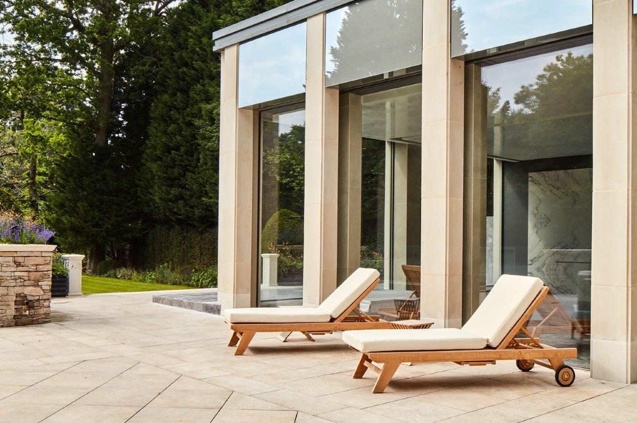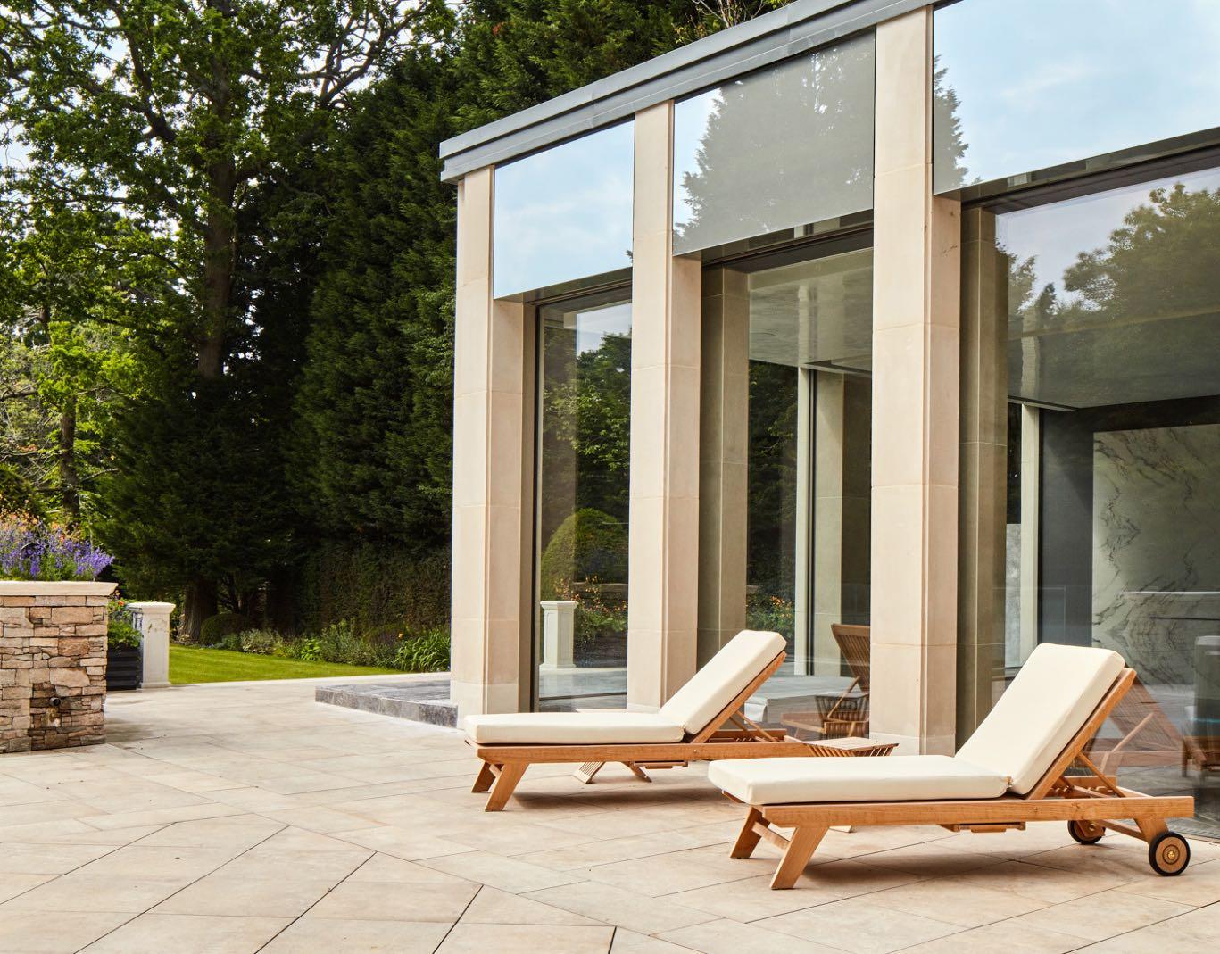 • Facing the main patio area and the landscaped gardens, the columns as shown in the adjacent photographs are clad in Portland stone finish cast stone. Internally, we carefully sourced a large format porcelain tile to match the cast stone, which was more appropriate and robust for the Swimming Pool environment.