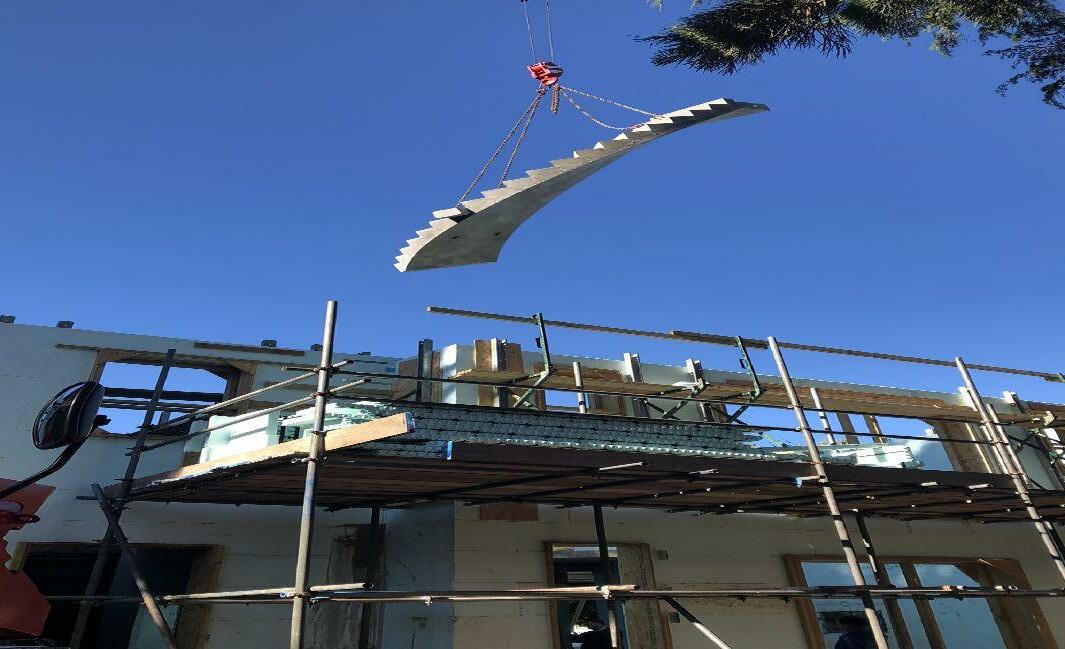 These photographs show the installation of the laminated, double-glazed roof over the informal dining room.