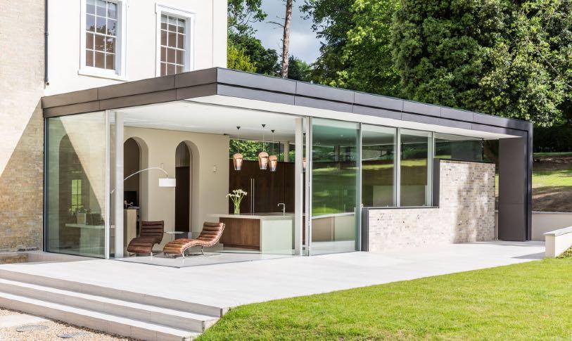 • Three panel double glazed laminated glass flat roof supported at the perimeter and via two powder coated aluminium beams. The beams not only provide the necessary support to the glass sheets, but also to two polished brass pendant lights that hang over the dining room table.