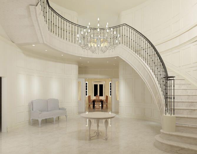 were delighted with the home’s external appearance, they had decided it would be preferable to have a more prominent sweeping staircase within the Grand Entrance Hall, with a formal dining room beyond that would face the main patio. They understood their request would require a great deal of thought and that it might not be possible