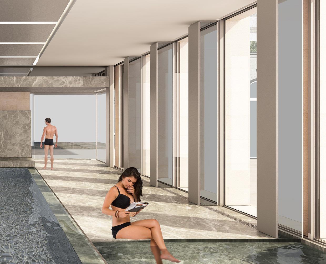Artificial lighting levels were considered to ensure they provided sufficient illumination but were in tune with the relaxing, therapeutic essence of the space. The ceiling, finished in polished plaster, already gives the space an uplifting radiance, so it was decided to limit lights on the ceiling. Illumination is provided via lights in the pool itself, uplighters to each of the perimeter columns, and LED lighting within a deep recess located over the pool.