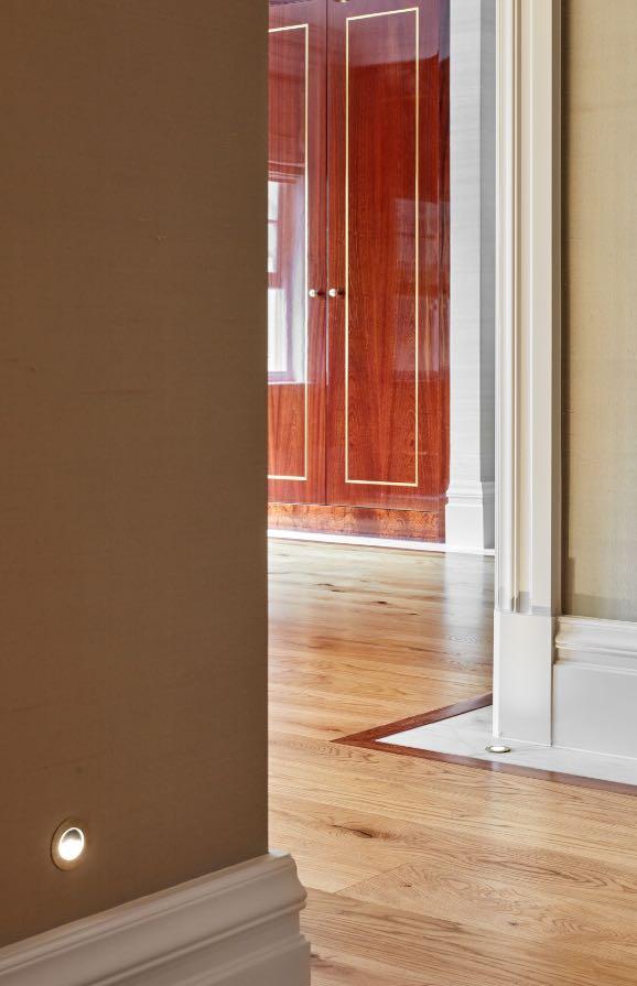 To the side of the master bedroom is the generous dressing room and en suite. The dressing room is split into two via the access to the en suite, with a smaller area next to the window, overlooking the Main Patio and landscape gardens, and a larger area that ends with a floor to ceiling full width mirror. All of the first-floor bedrooms have subtle uplighters to architrave plinth block and have matching low level wall lights in strategic locations as shown in the below photograph. Some of these lights are controlled via PIR rather than light switches, to provide low but safe levels of illumination for walking around the house at night without having to turn on larger lights that might disturb other occupants of the bedroom.
