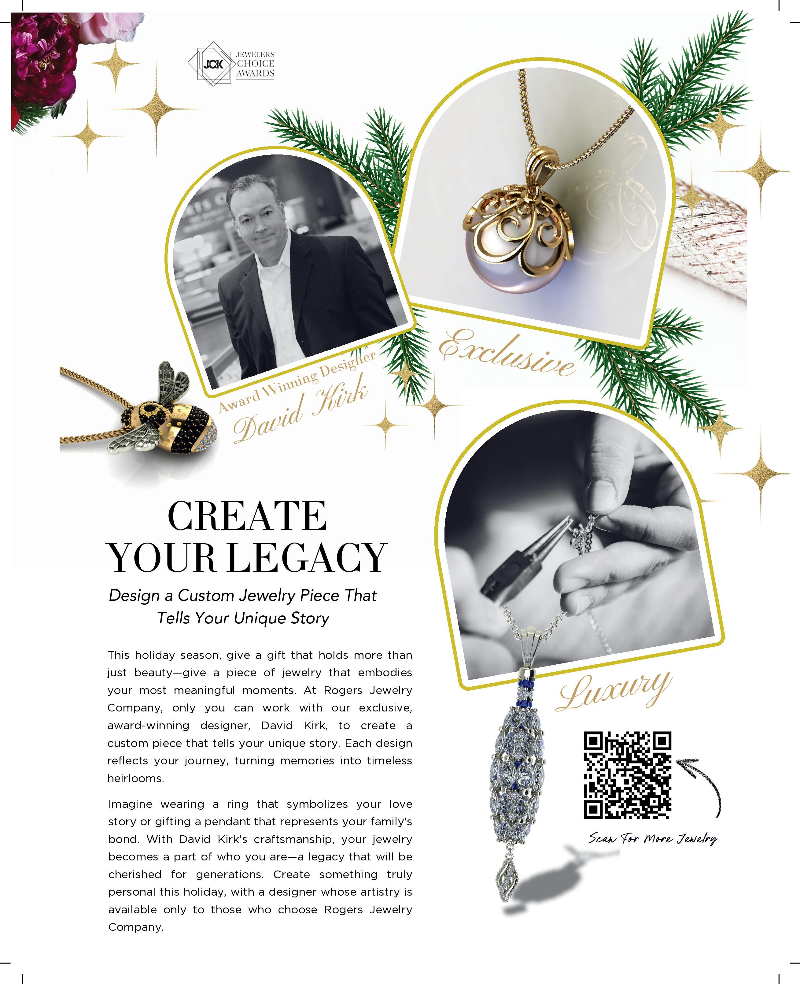 In addition to state-of-the-art equipment, CAD/CAM technology, 3-D Printers, high pressure casting and laser welders, Rogers boasts the services of awardwinning designer David Kirk. A master artisan with a unique creative instinct, David can work with you to take even your vaguest notions about what you might like and turn it into a masterpiece of your own design.