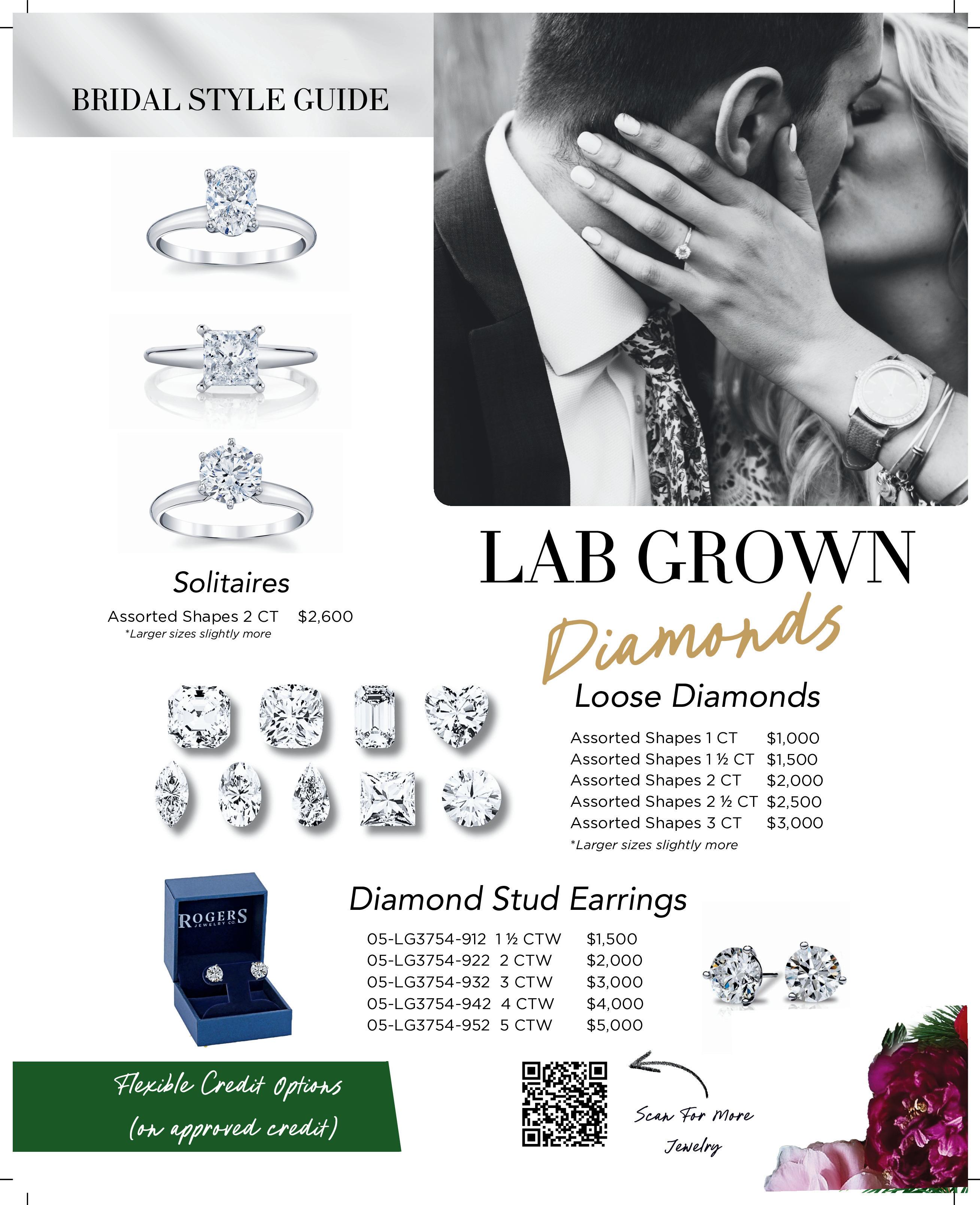 Rogers Jewelry Co. now carries Lab Grown diamonds. As the price has stabilized we can now supply these at fair prices to service our customers.