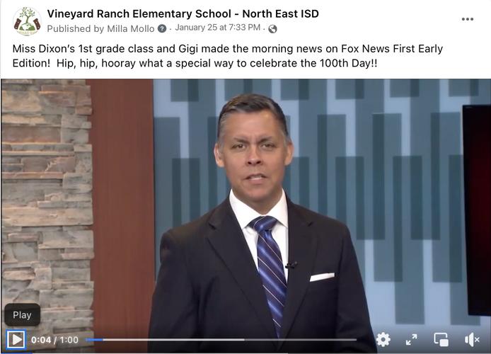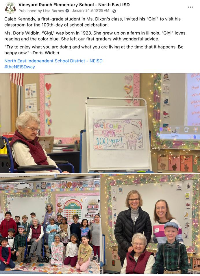 A special thanks to Vineyard Ranch ES for sharing this post and also sending it to the Communications team! After Vineyard Ranch ES posted this uplifting story, news outlets immediately began calling and emailing. They also wanted to highlight Gigi's special visit on the 100th day of school!