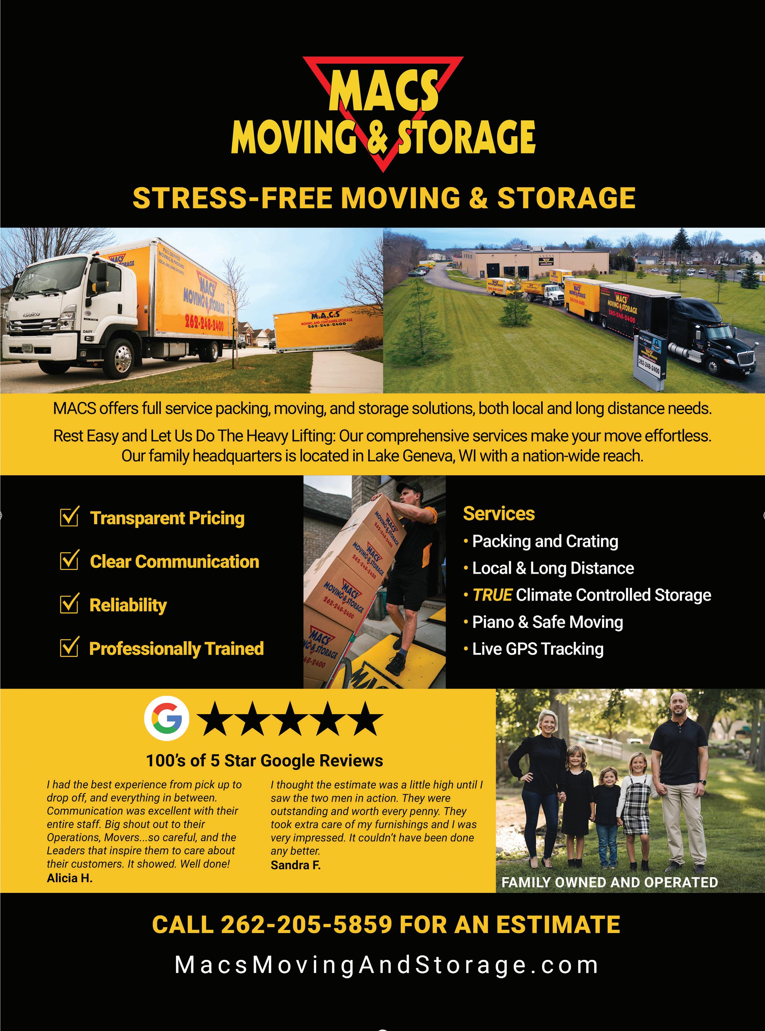 MACS MOVING & STORAGE 901 Maxwell St. Lake Geneva, WI 53147 262-379-8374 macsmovingandstorage.com