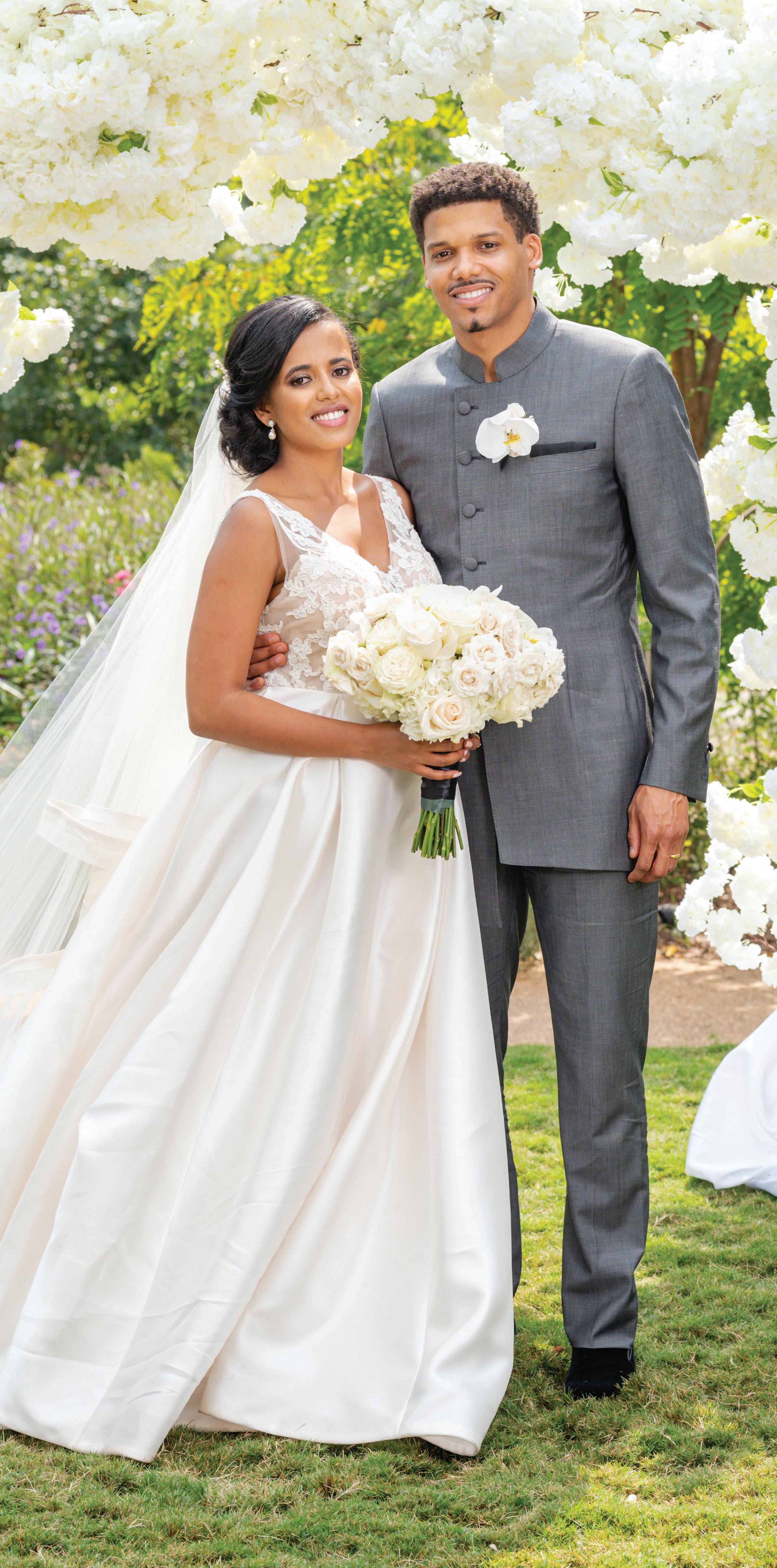 The couple planned a “whimsical, romantic wedding,” exchanging their vows before 40 of their closest family and friends in November of 2020 (on the bride’s birthday!), livestreaming the ceremony to those who could not attend in person. Annica opted for a couture gown in ice blue, and her veil was custom-made by her 91-yearold grandmother. Nick wore a custom blue suit with maroon accents to complement the wedding colors of rose gold, maroon, blush and ivory. The bridesmaids wore dresses in a shade of mauve and proceeded down an aisle strewn with rose petals.