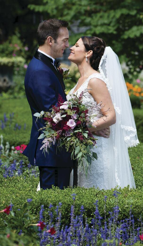 GOWN Florent gown by Delphine Manivet, delphinemanivet.c om ACCESSORIES Veil by Violet Bells, violetbells.com | JEWELRY provided by Razny Jewelers, razny.com | SHOES Carlos by Carlos Santana, carlosshoes.com | HAIR & MAKEUP Montage Salon & Spa, montagesalonandspa.com