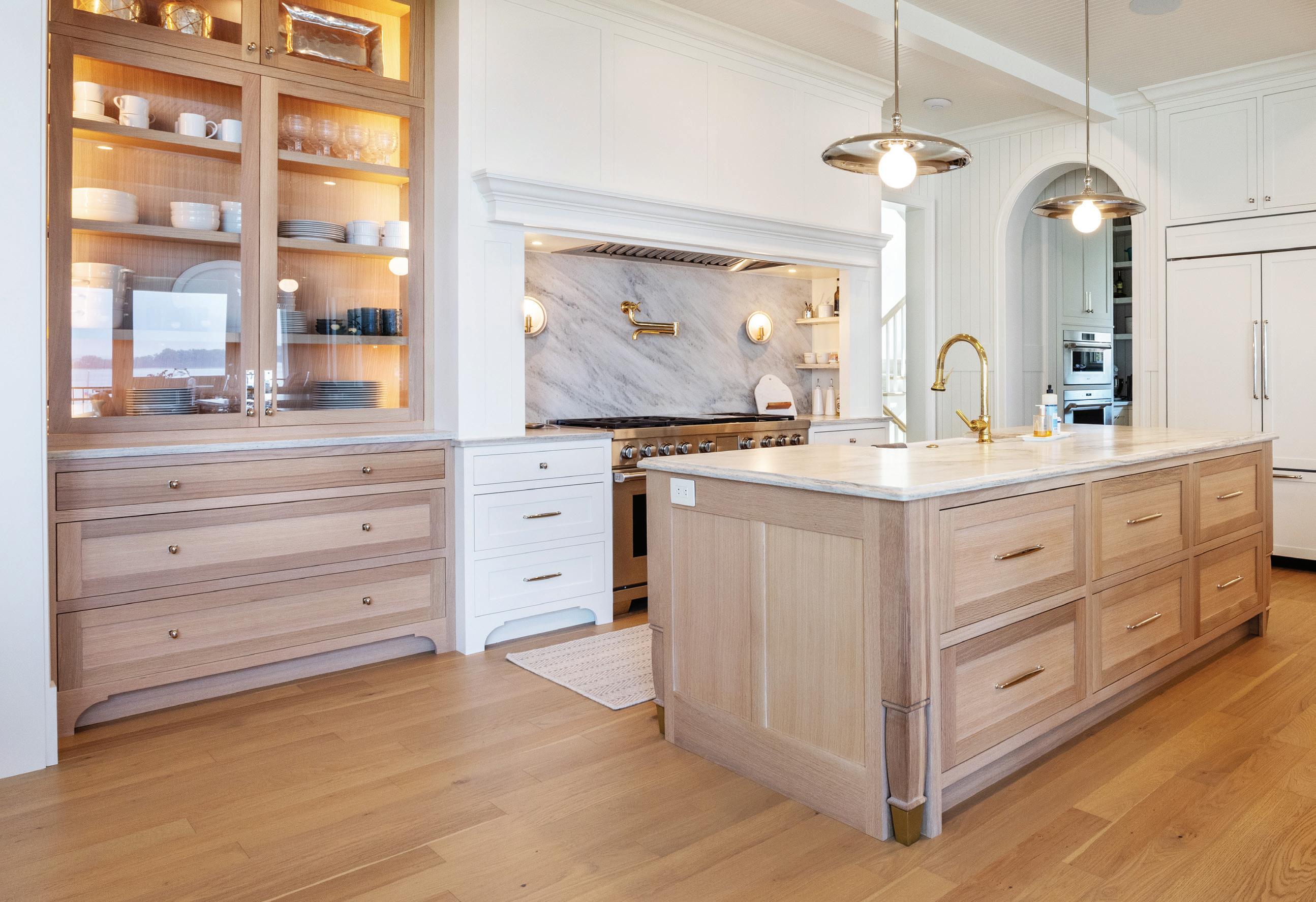 • A kitchen, lighted by a 15-foot bank of windows, with a wrap-behind formal pantry