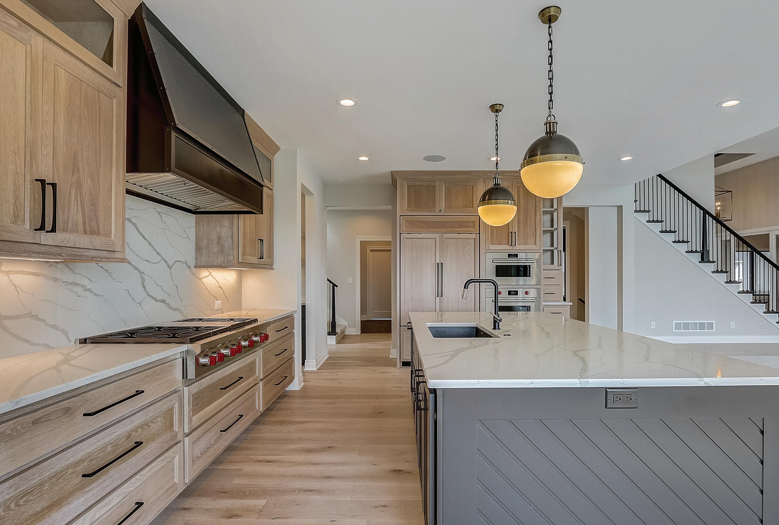 Inside, 10-foot ceilings and expansive windows brighten the open floor plan. Luxury vinyl plank flooring extends throughout the home, while shiplap walls add warmth and texture. Statement lighting highlights each space, complementing details like the great room’s stone fireplace, custom hickory built-ins and rustic alder beams. Amish-made cabinetry enhances the interiors. The kitchen features Sub-Zero and Wolf appliances, durable finishes, and a walk-in pantry with storage, prep space and