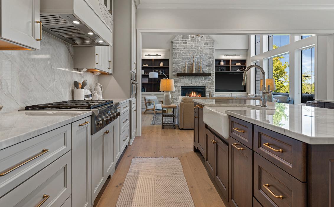 The designer kitchen is the heart of the home, showcasing reeded detailing and custom woodwork that reflect Midwest Homes’ 56 years of quality craftsmanship.