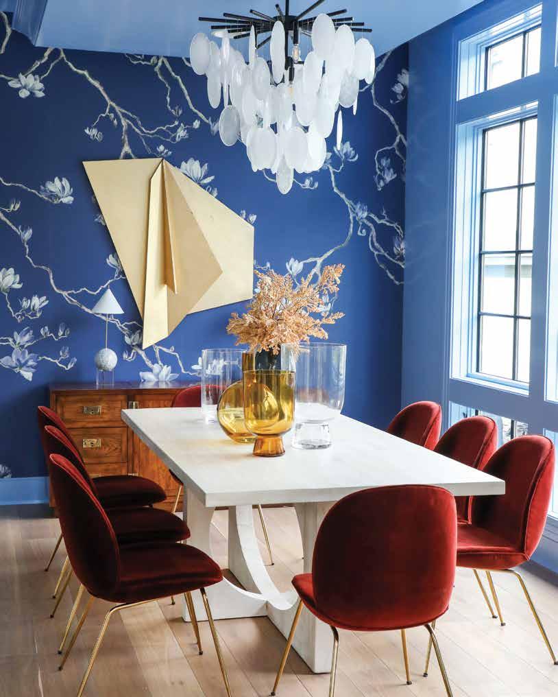 With an open, airy floor plan on the main floor, each room seamlessly flows into the next. The show-stopping dining room (shown on page 45 and above, right) skillfully weaves in shades of periwinkle blue, camel and rust for a gorgeous, eye-pleasing medley of color. An accent wall covered in Phillip Jeffries wallpaper serves as a focal point, as does the origami-like art piece on