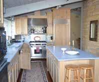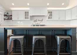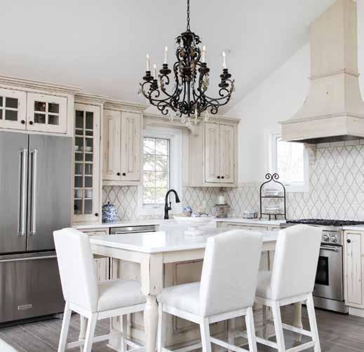 and Jim incorporated an expansive, Calacatta marbletopped island with seating for six; plentiful cabinetry designed by Natalie Spiniolas of Geneva Cabinetry; topof-the-line appliances (like the Sub-Zero fridge and Wolf stove); and a built-in buffet behind the island that’s a serving spot for parties as well as provides storage.