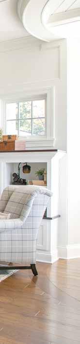 Everyone can also enjoy each other’s company in the adjacent living room that has a Wisconsin limestone fireplace, traditional furnishings and comfortable throw rugs. Hand-scraped wooden beams echo the cozy feel. Even though the home itself is stunning—the lake view can’t be beat just mere feet away via the expansive floorto-ceiling windows that showcase the vistas spectacularly. (This house is one of the few in this neighborhood that’s actually on the water, says George).