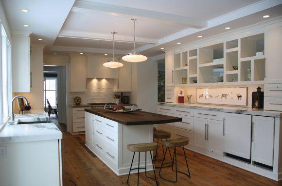 The Shaker-style kitchen has white cabinets but a contrasting handcrafted island. Soapstone countertops and a backsplash with blue rippled glass tiles complement the colors in the soapstone and mimic the color of the lake. The cooktop hood is steel with an antique patina, and the weathered tone is picked up with the three pendants above the island. The homeowners did not want a formal dining room, so an upgraded eat-in-dining area opposite the kitchen was created with a boxed bay window to maximize the lake views.