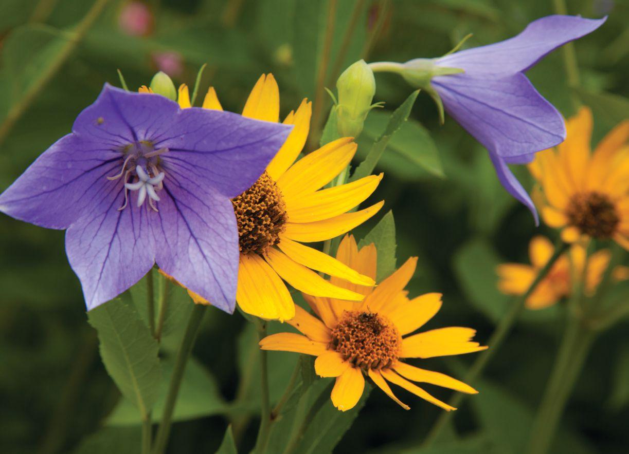 lefT: The prolific yellow Coreopsis, as long as it is deadheaded, is a non-stop blooming perennial. aBove: The prolific and spreading heliopsis ‘Summer Sun,’ shown here with Platycodon grandiflorus, makes a colorful mid to late summer display.