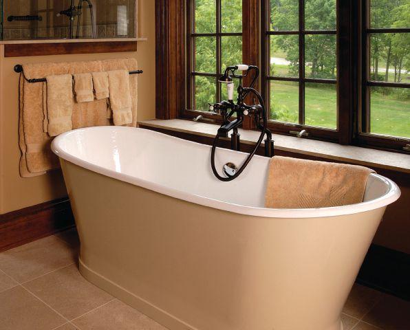 toP: The master bath features an elegant freestanding bath tub situated in front of a bank of windows looking out at the expansive lawn. BottoM: The twin vanities with plenty of storage are positioned opposite the bath tub to take advantage of the room’s natural light. right: each of the guest suites features its own luxurious bath to ensure complete privacy.