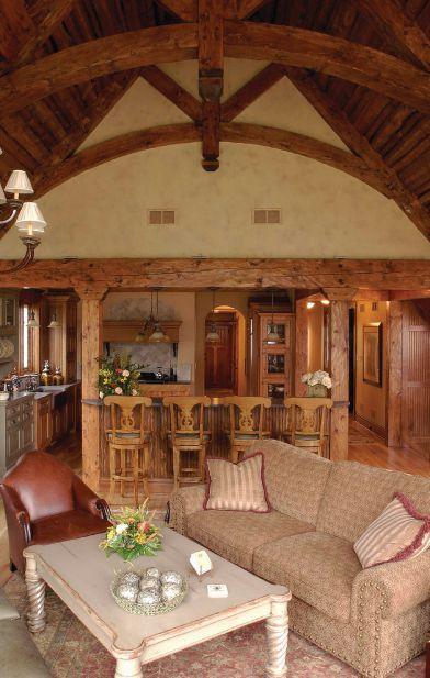 toP: in addition to top-of-the-line appliances, the kitchen features copper/metal and stone countertops, and leaded stained glass windows. BeloW: in keeping with the rustic character of the architecture, the Pickells selected neutral colors along with dark reds, light green and gold for their décor, allowing the natural wood to take center stage. right: The stone fireplace with walk-in hearth and the hand-hewn timber cathedral ceiling in the great room guided the design of the home, evoking a hunting lodge in the french alps.