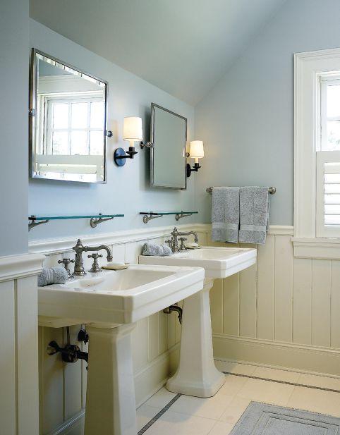 The tongue and groove ceiling detail is a signature feature throughout the house, providing added texture to all rooms. The master bath (above) features double vanities, one with a place to sit and apply makeup. limestone on the countertops and tub deck, flooring of multi-colored tumbled limestone, a tongue and groove wall treatment and built in storage complete the look. one of three guest baths is trimmed with wainscot detailing. double pedestal sinks sit atop a limestone floor accented with a small mosaic glass tile border.