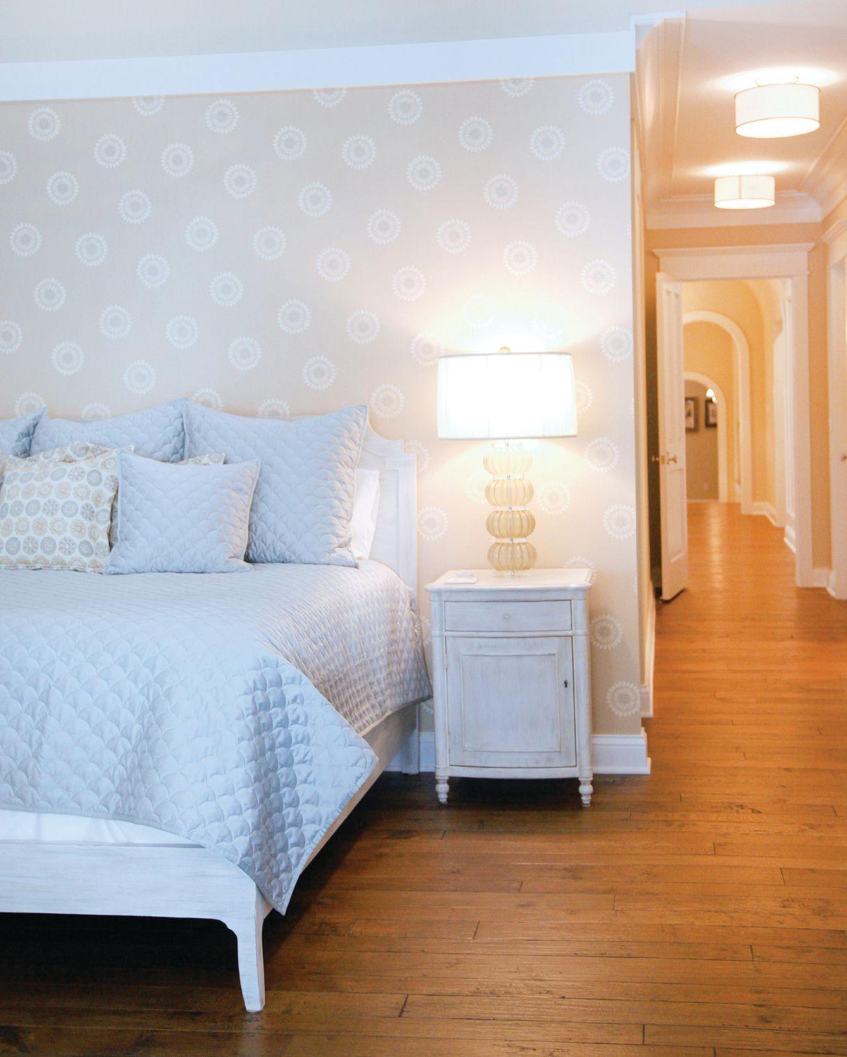 Interior designer Katie Wozniak of Katherine Elizabeth Designs helped the homeowners select soothing, water-inspired colors for the bedroom.