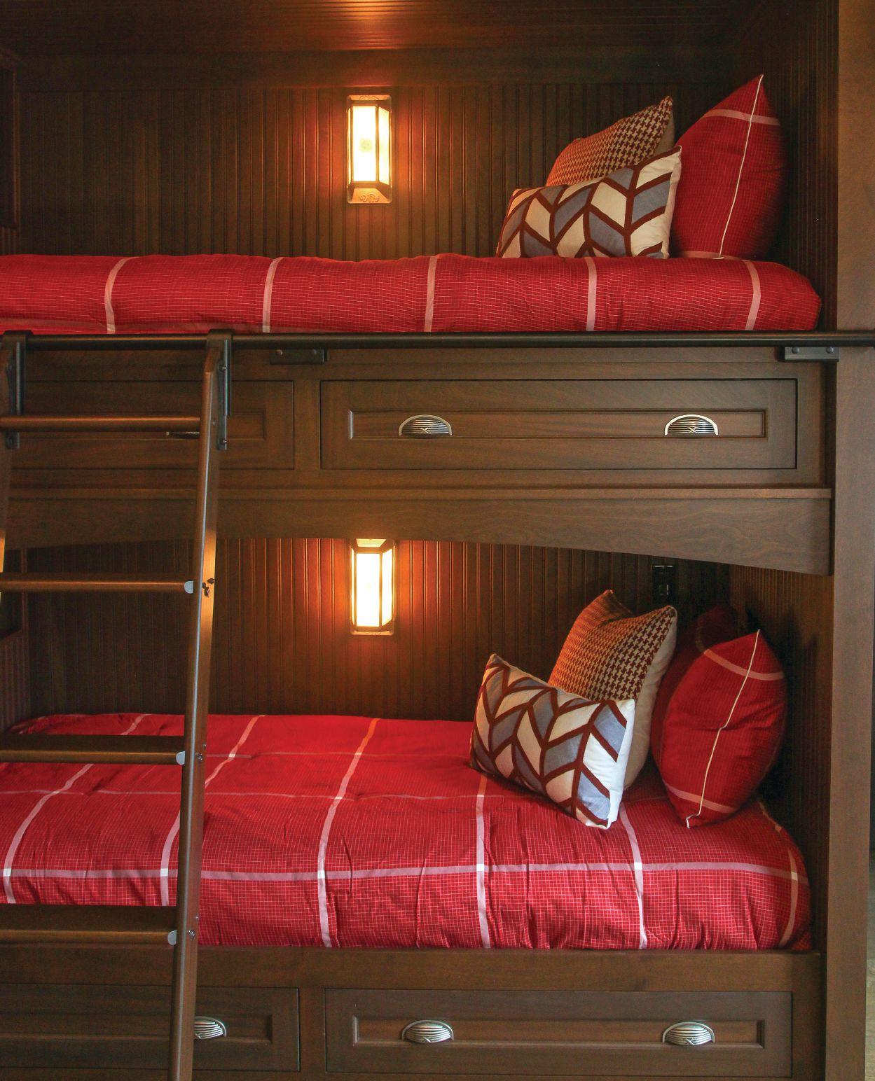 With so many family members, the homeowners included many special touches for their younger visitors, like two unique bunk rooms that have four beds in each. One room was designed to look like a vintage Pullman car with mahogany built-ins and velvet drapes that close off each bed. The other bunk room was designed around a vintage boat theme.