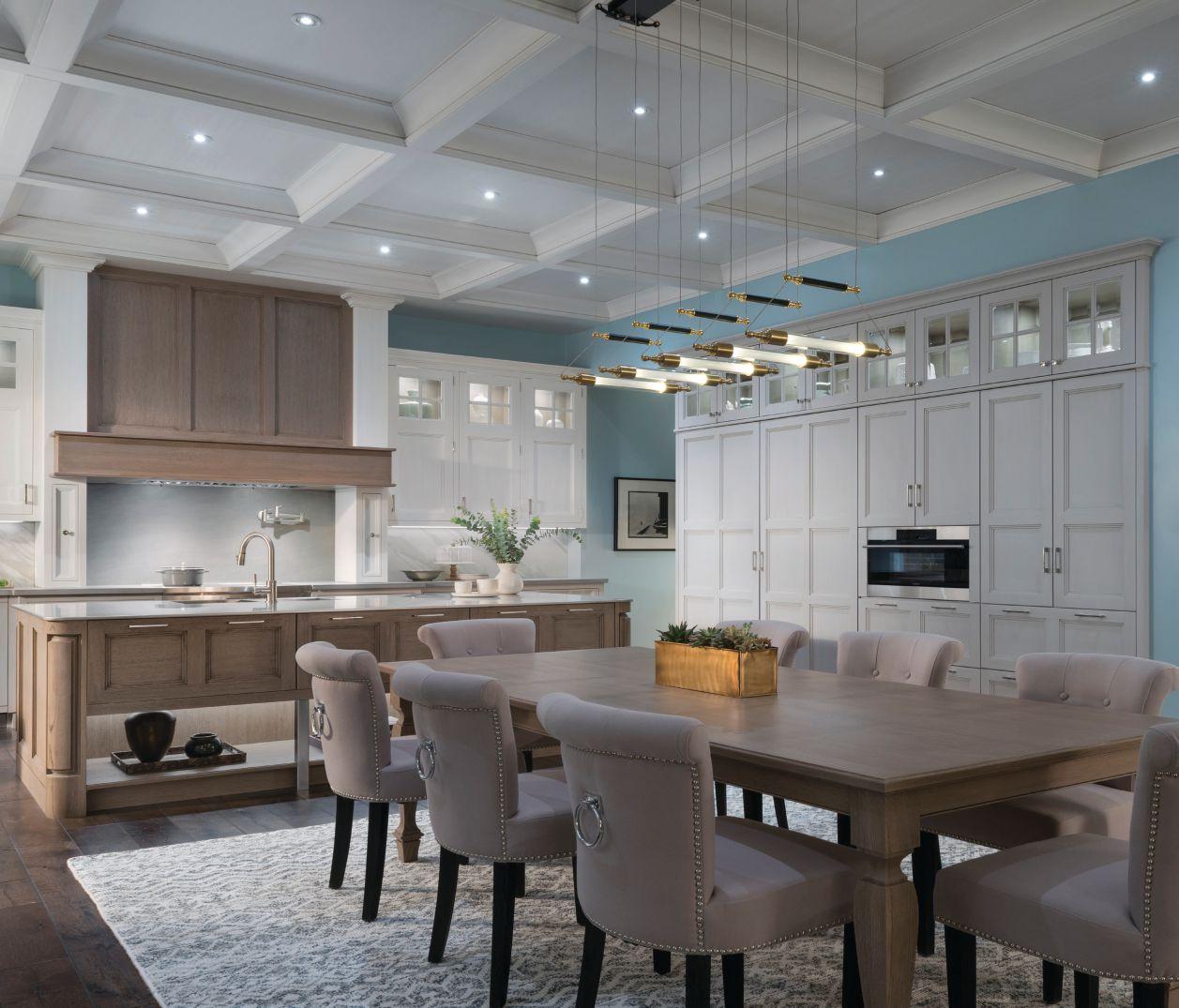 The main floor flows from kitchen to dining room to great room—and all of the design choices had to flow together, says Sassano. His team worked off a palette of timeless neutrals with pops of blues and greens.