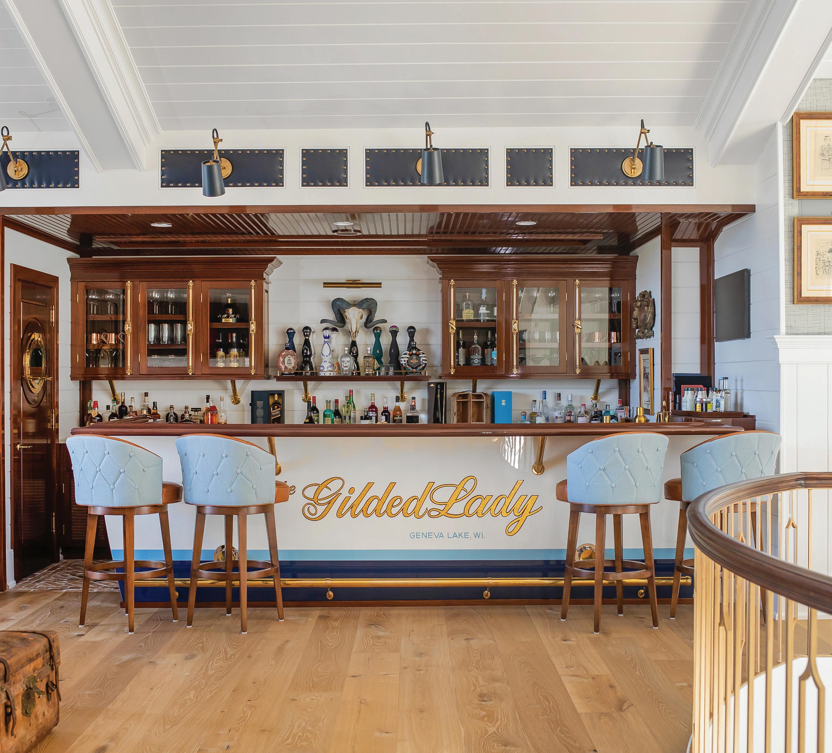 “The boat bar is patterned after the historic Gage Marine tour boats on Geneva Lake,” Sassano says, pointing out the storage closet behind the bar features an old porthole-turned-mirror.
