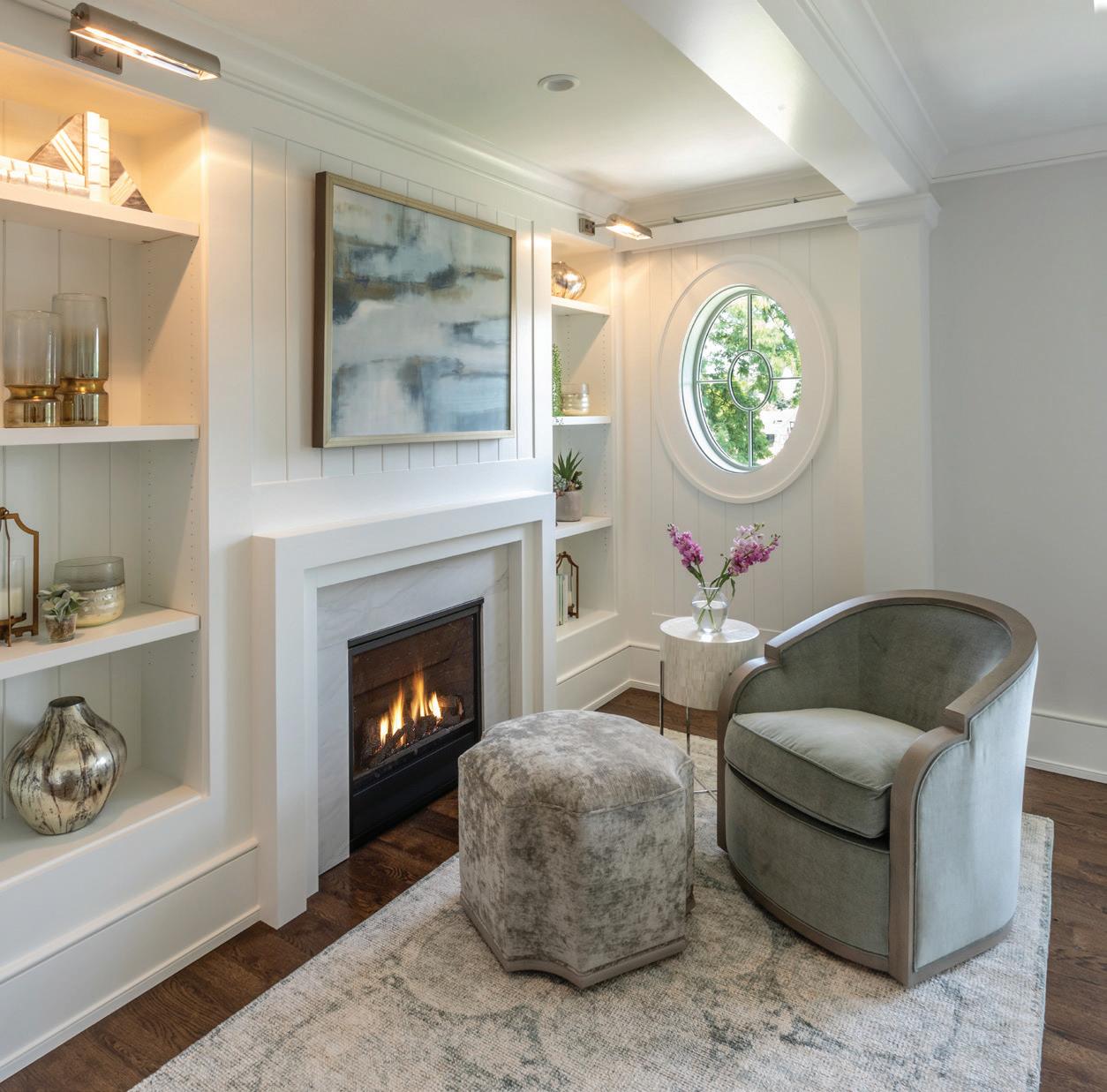 Channeling themes like “modern mountain” and “hygge,” Cheyne helped Kunes achieve a perfect blend of sleek, yet rustic comfort. Skilled craftspeople from Heritage Board and Beam installed, stained and hand sanded oldgrowth barn wood sourced from throughout Wisconsin to create the rustic wood flooring. The company also built the coffee table, explains Kunes, finishing it in a shou sugi ban finish, which burned the wood to create a black char.