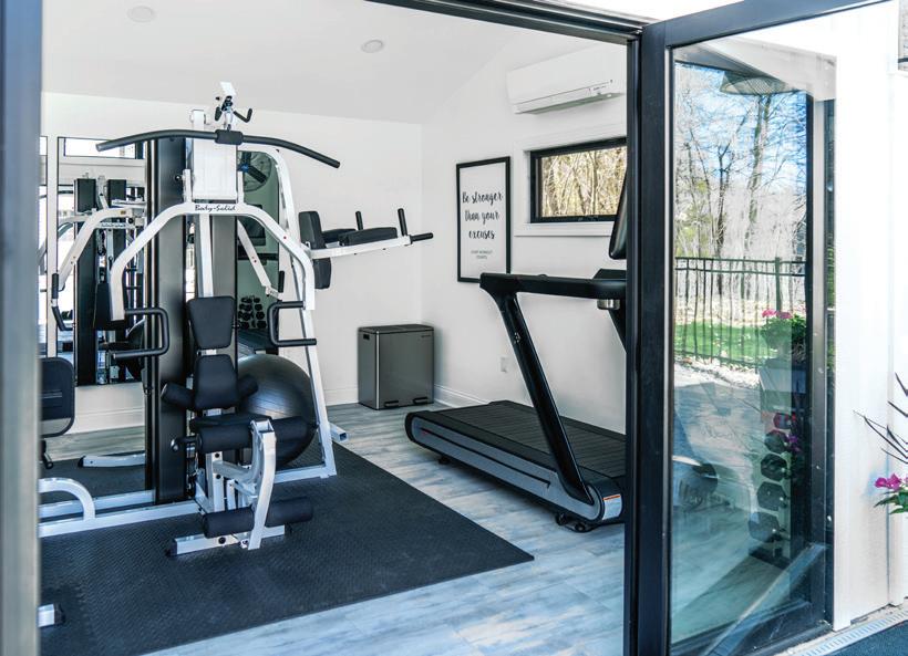 Top: The durable vinyl plank flooring can easily withstand workouts. Right: Board-and-batten siding and black-trimmed windows and French doors give the workout building a clean exterior look. Left: A fridge keeps beverages cold for the family. The four Hayes kids, which range in age from 11 to 18 years old, use the room constantly, along with Jocelyn and her husband, Joel. ❦