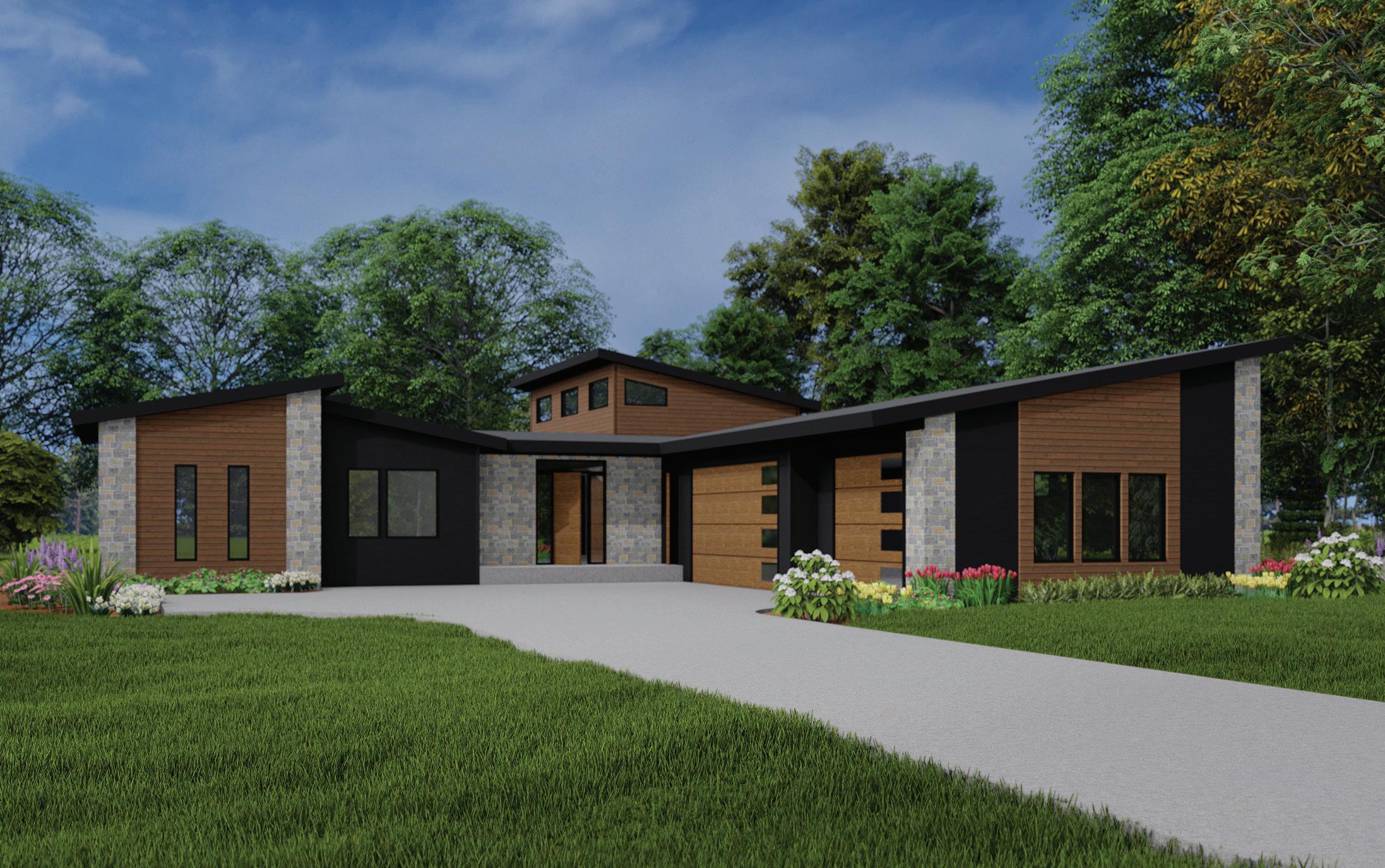 We incorporated lots of modern and mid-century through geometric and circular architectural details. In the office you’ll find a drop-down ellipse ceiling with perimeter puck lighting. The living room is sure to catch your attention with the spherical light fixture design and custom-built TV wall. A stairs design unto itself; with a bank of cascading glass windows and custom-made metal stair balusters. Notice how well lit a Northern facing home can be with the right design. Each side of the home has a unique blend of stucco, board ‘n batten, lap siding and Longboard metal siding.