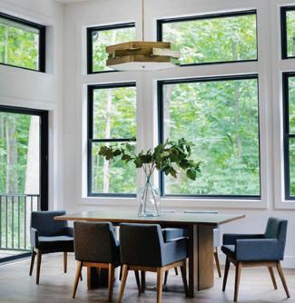 Exterior LP SmartSide horizontal siding in Canyon Brown is complemented by board and batten siding in Sherwin Williams Sealskin, and natural cedar and stone accents. A black, standing-seam metal roof adds clean lines and sophistication. The covered porch invites you into an openconcept kitchen, dining and great rooms. Expansive window walls draw natural light and picturesque views into the great room and first-floor primary suite. The floor-to-ceiling fireplace features floating bench seats and a black walnut mantel reclaimed from the property.