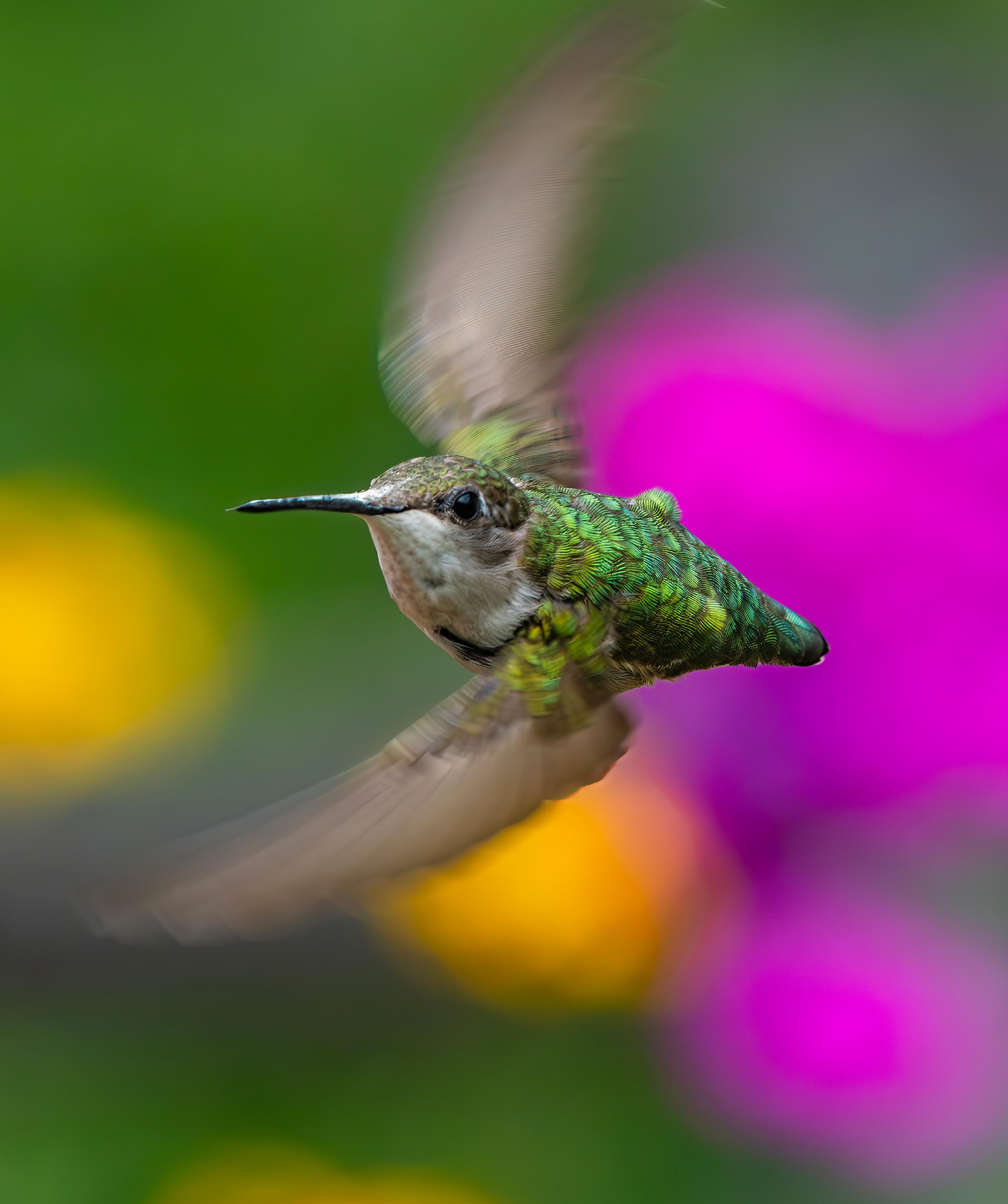 Hummingbirds can turn on a dime and fly backwards The hardest part in photographing them is to get them in focus when they are constantly moving. It took me several hours over two days to get just a few photos. This hummingbird is six feet from me and the flowers in the background are about 12 feet away. That puts the flowers out of focus and provides a beautiful background color. The photo was taken at 1/1600 of a second and you still see motion blur in the wings. Hummingbirds can flap their wings over 50 times per second and fly over 30 mph. They move so fast that you can hear a humming sound.—Paul Sundberg
