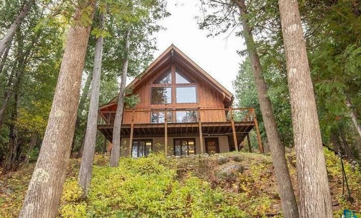 When a custom builder creates a home for themselves, get ready for something special. Here is that home! The lot is choice: end of the road, abutting public land, with trails leading up to Pincushion Mt and beyond. 2.2 acres of forest, yard and gardens. A sweet little creek offers music, including a waterfall. Its quiet back here, but not far from all the delight and action of America’s Coolest Small Town –Grand Marais. Inside the home many unique features crafted by a visionary builder: custom kitchen cabinets, tasteful built-ins throughout, kitchen countertops of dyed concrete, cathedral ceilings to name a few. Plenty of space: two bathrooms, 3 bedrooms, and a den or office, up to you. The living room opens to an expansive decking system that ties the studio space above the garage to the main home. Nature lovers check out the solarium! Includes a heated built-in planter, home to an old-growth jade symbolic of the love and life that thrives at this property. The family room has a kitchenette and gas fireplace. Come experience the
