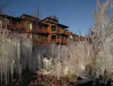 The process begins with a steel cable strung between two 65-foot tall towers. Then, Hanson’s self-developed software program targets a spot in which to shoot a two-second burst of water. The program does this by calculating a target distance, angle, wind speed and temperature four times a second. The repetitive bursts of water, shot on the cable, drip down the cable and freeze, slowly building a sculpture over time. The cable is removed once the base is built, and the water is then shot directly onto the sculpture. The complex process, designed entirely by Hanson, involves specifically-programmed computers, algorithms and numerous wires, seismic sensors, circuit boards, pipes, pumps and filters.