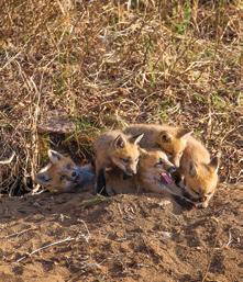 This morning we got up bright and early to make the 40-minute drive to a fox den in time to catch the morning light. Then we waited almost an hour for the family to make its appearance. We were just starting to wonder if they were even in the den when Jessica spotted one of the adults coming out of the woods. The adult went to the entrance of the den and started making noises, calling the kits to come outside. Seconds later we saw one little fox head pop up out of the den, then another, then another until finally there were five of them out in the open.—Travis Novitsky