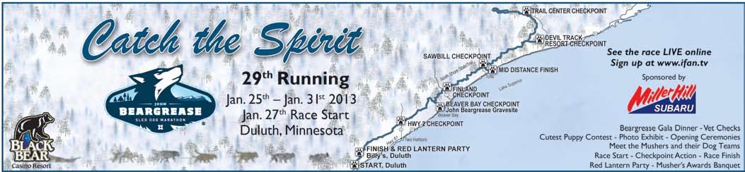 The 29th running of the Beargrease marathon celebrates the life of John Beargrese, who delivered mail along the North Shore via sled dogs during the 19th century. It covers 400 miles between Duluth, Gunflint Lake and back. For more info, visit www.beargrease.com.