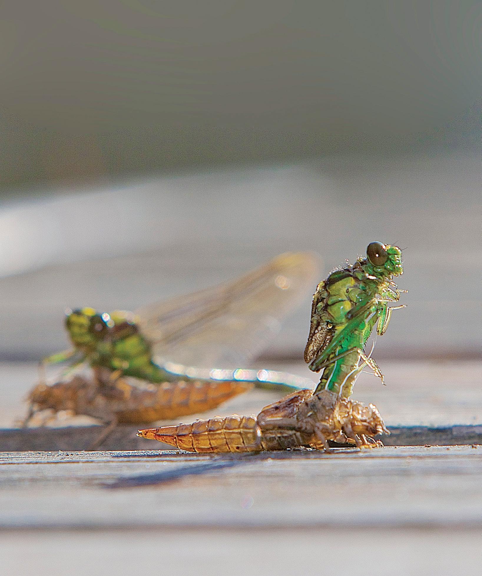I always see the empty exoskeletons around rocks and our boat dock at the lake. But one morning, early, several nymphs begin crawling up the dock from the water, then stop. After a short period, their backs crack open and an adult dragonfly slowly emerges. I watch and take some photos as this “new beginning” seems to go on forever. I have never seen this process before, but always wondered seeing the exoskeletons around. In reality, it’s easy to miss, since it took them usually 10 minutes or less to fly away, but I was at the right place at the right time.—Chris Gibbs