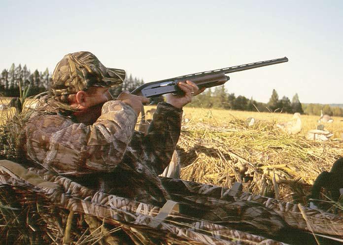 Most field hunters use what’s called a coffi n blind. This contraption allows you to lie in the field fully covered by camoufl age. Generally a large set of goose decoys is set up in such a way that the birds will fl y into them and make fi nal approach very close to the hunters. The migrating geese are then called into the decoys by one of the hunters. When the birds are within range, you pop out of the coffin blind much like a jack-in-the-box. It’s an exciting way to hunt these large birds.