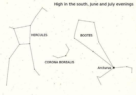 High in the south, kiteshaped Bootes, the herdsman, sails westward, anchored by brilliant Arcturus. Moving east, we see the lovely semicircle of Corona Borealis, the northern crown, and