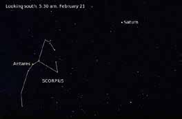 Saturn, a morning planet, starts rising before midnight in February and ends March coming up in the east a couple of hours after sunset. It keeps appearing earlier because Earth is catching up to it in the orbital race. Bracketing the ringed planet are bright Spica, in Virgo, to the west and giant red Antares, the heart of Scorpius, to the east.