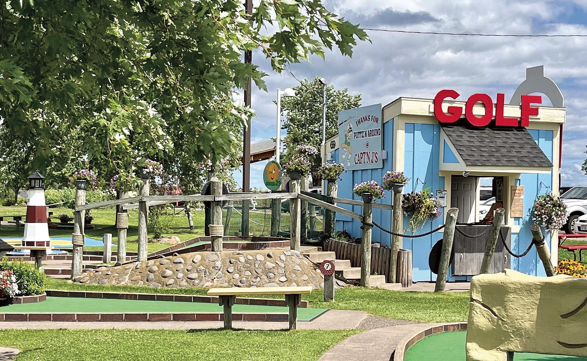 From late spring to early fall, if the weather is nice, Capt’n J’s Mini Golf welcomes families, groups of friends, and courting couples. The radio, always tuned to KOOL 101.7, softly plays happy, toe-tapping rock and pop music from days gone by. As the golfers make holes-in-one, or miss easy putts, or struggle with the volcano—the hardest hole on the course—cheers, laughter, and groans fill the air. Everyone has a good time. Port originally thought it would be kids and teenagers who came to play, but he discovered a wide variety of people relish mini golf. Grandparents love to play with their grandchildren. Every year UMD brings their foreign exchange students for an outing. Once a year about 15 Harley motorcycles rumble into the parking lot, and bikers dressed in their leathers compete in a friendly round. Using mini golf to encourage a sense of esprit de corps, athletic teams from UMD and UWS come to golf, and occasionally a bus pulls in with an outof-town college team, who play to pass the